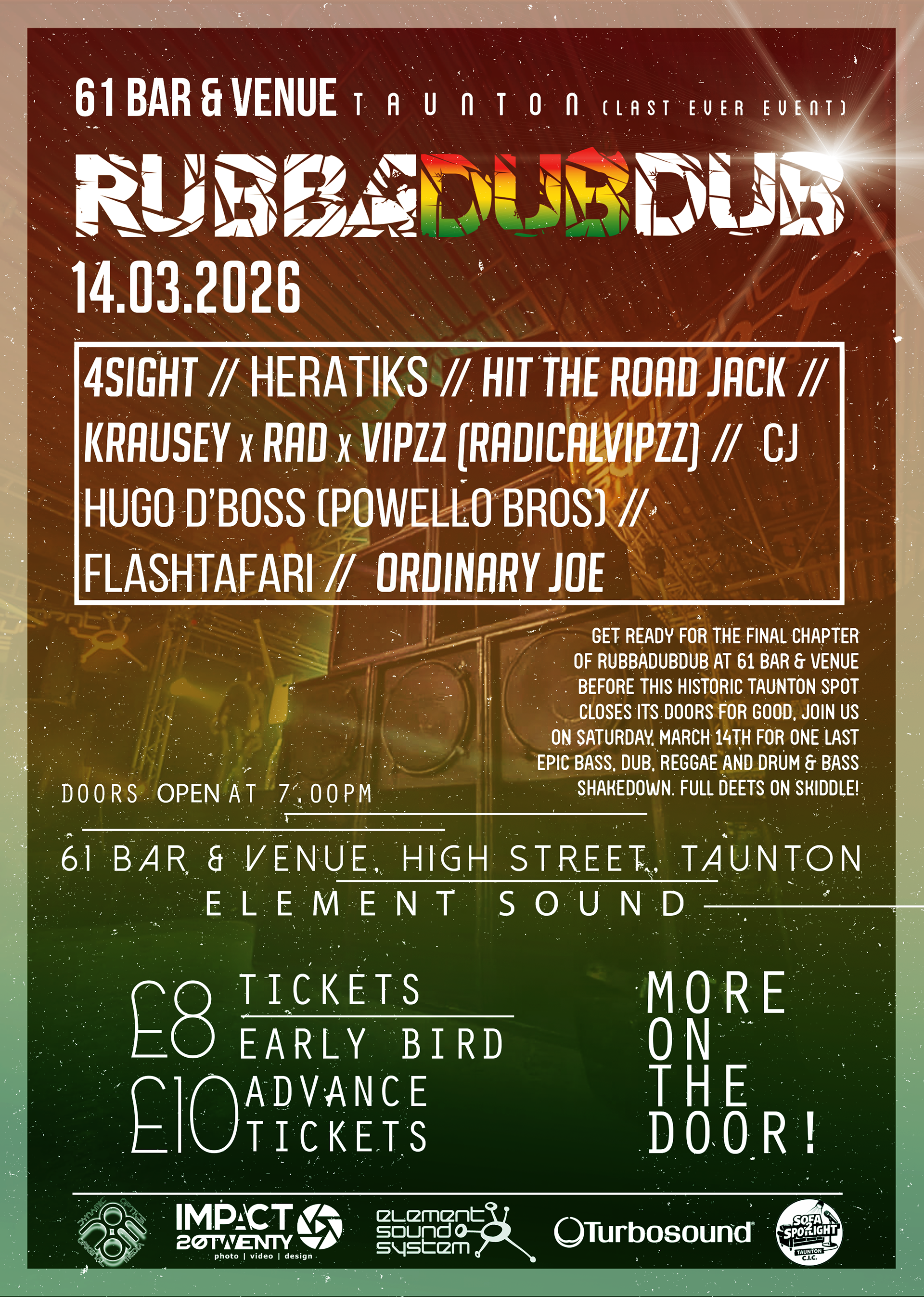 The lineup is absolutely stacked with OGs who shaped the last 17 years of RUBBADUBDUB, including 4Sight, Hit The Road Jack (Mammoth Sound), Flashtafari (Irie HiFi), Ordinary Joe, and CJ.
